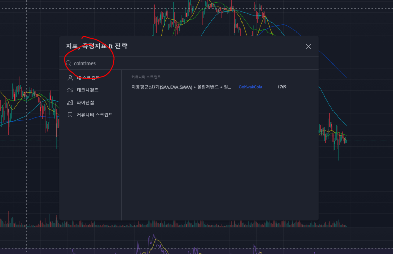 지표 검색 창에서 cointimes ~@ 라는 지표를 추가했을 때